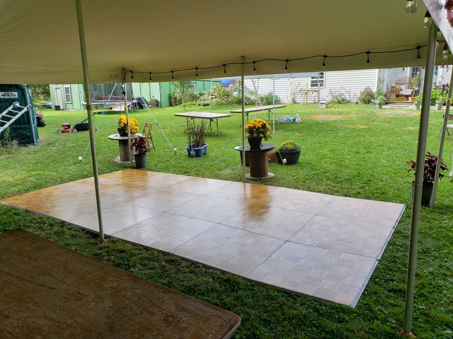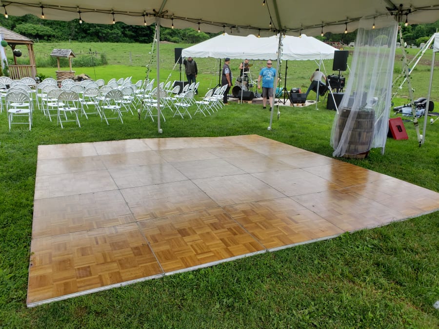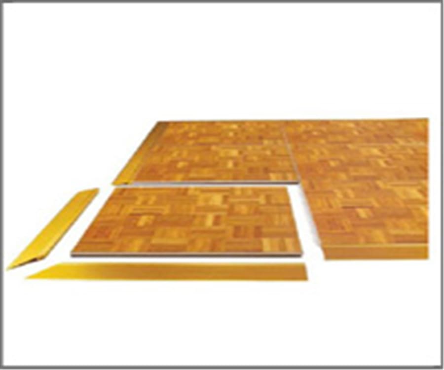 Parquet hardwood dance floor. Tiles are rented in 3 x 3 sections. Can be used inside or outside under a tent.