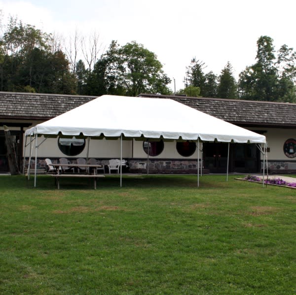 Frame tents are more open compared to the pole tents. There are no poles going down the center. They are self supporting so can be installed on most surfaces such as concrete, blacktop, gravel and grass. The frame tent still needs to be weighted down to the ground by using stakes or concrete blocks. Frame tents are much more versatile than the pole tents..