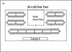 A 30x 60 pole tent will have 1800 sq feet of space to use with three poles down the center.