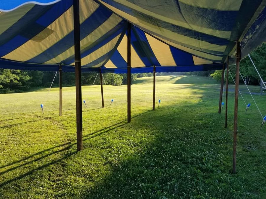 * Blue and white striped tent